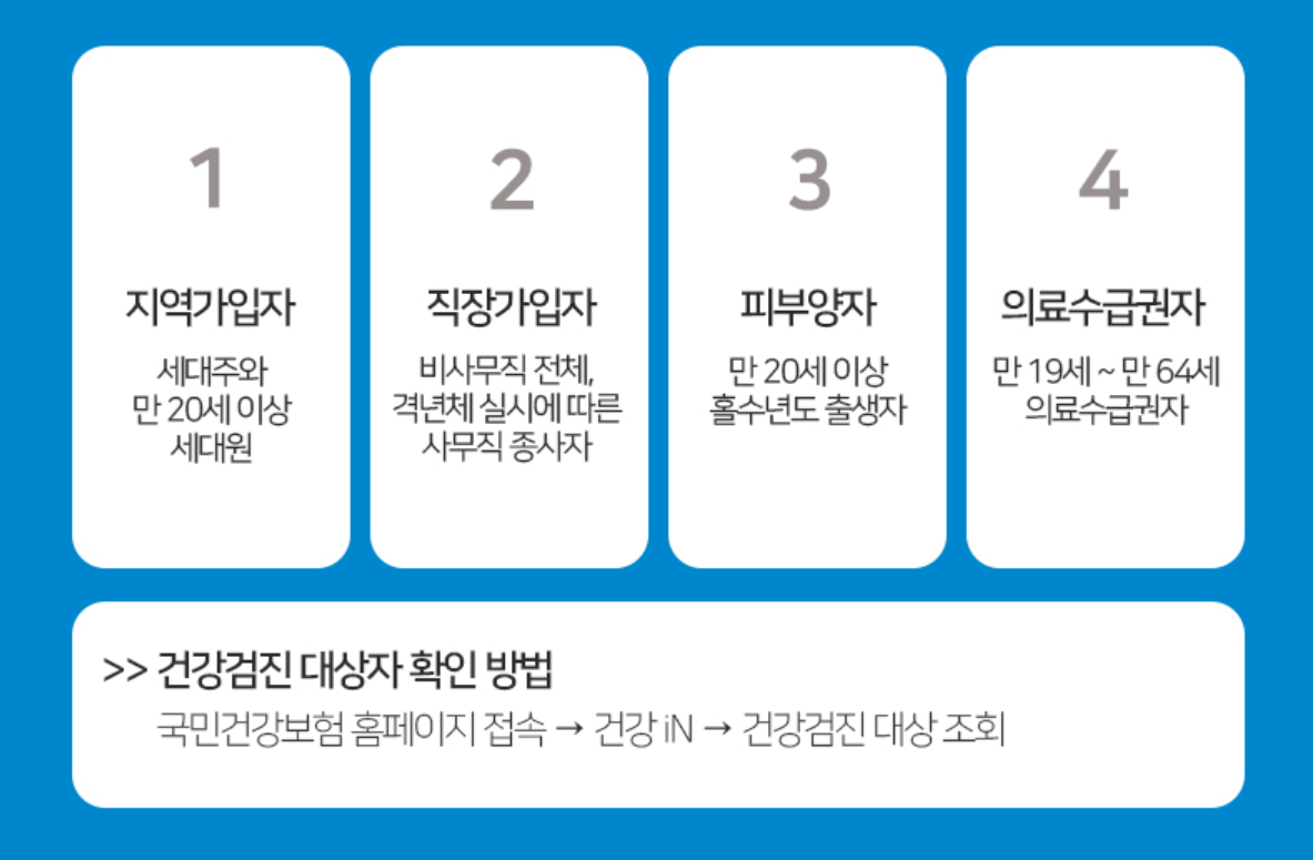 국가건강검진은 건강보험가입자(지역가입자, 피부양자, 직장가입자), 의료급여수급자라면 누구나 받을 수 있는 혜택입니다.