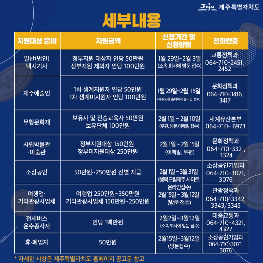 도는 2020년 3월 1일부터 2021년 1월 29일 사이에 휴업 또는 폐업한 소상공인은 12일까지 제주형 재난지원금 신청을 해야 된다고 설명했습니다. 제주형 제4차 재난지원금 온라인 신청은 3월 말까지 운영할 계획입니다.